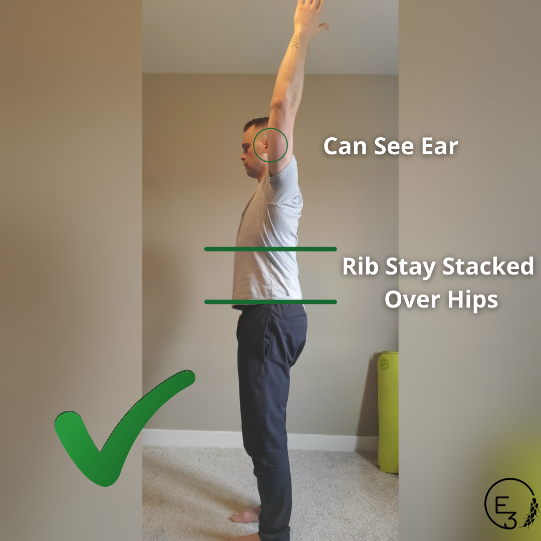 If you can see your ear in front of your arm while keeping your ribs properly stacked over your hips, congrats! You have the necessary range of motion to lift overhead. If you can’t quite see your ear in front of your arm, don’t worry! Here is an exercise option for you!