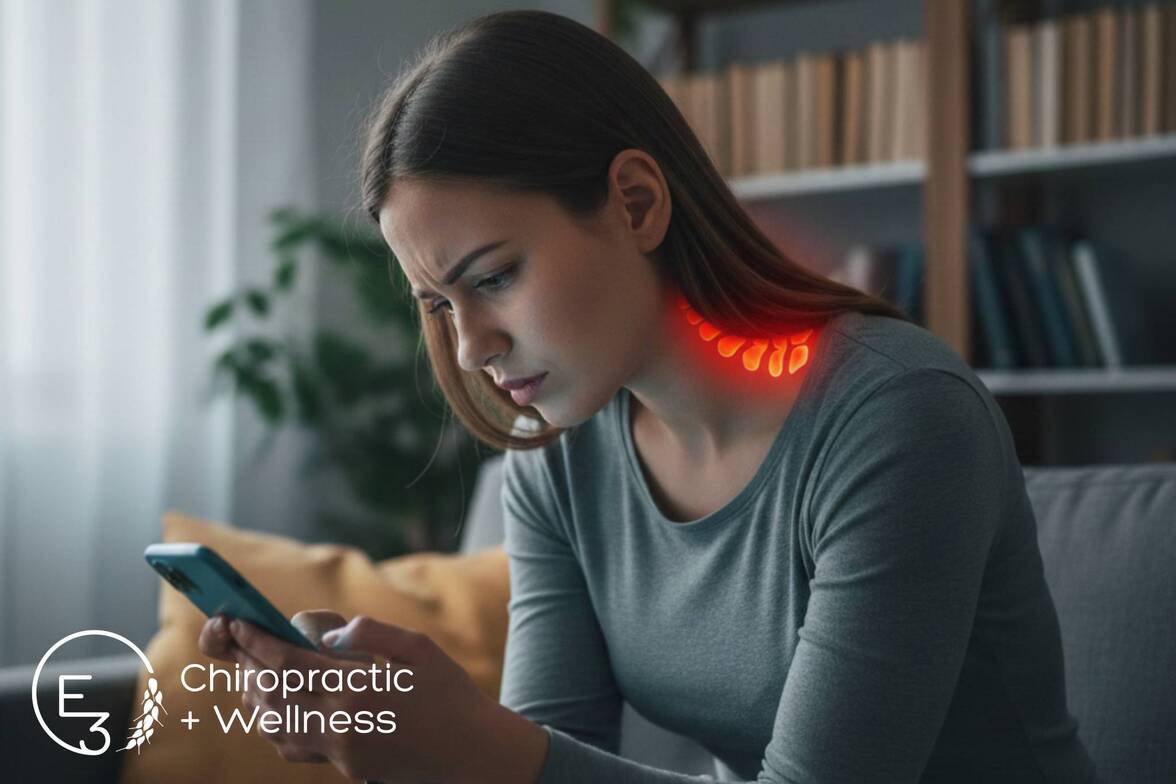 At E3 Chiropractic + Wellness, we see the consequences every day: Tech Neck (that forward head posture), tight hip flexors, and a weak core. Our goal is to empower you with active, educational solutions to reverse these effects.